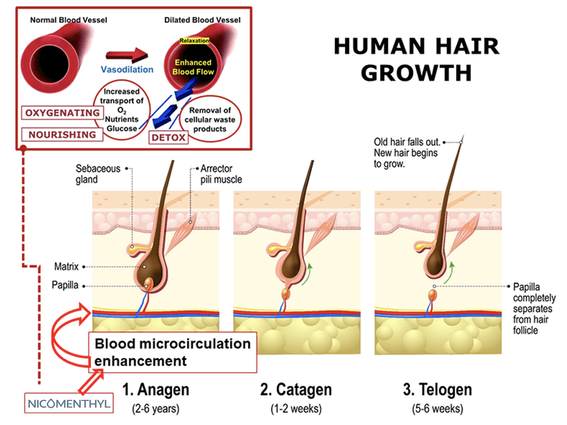 The increased blood flow generated by Nicomenthyl 20 in the hair bulb zone is essential for oxygenating, transporting nutrients and glucose, removing cellular waste products, as per the graph shown below.